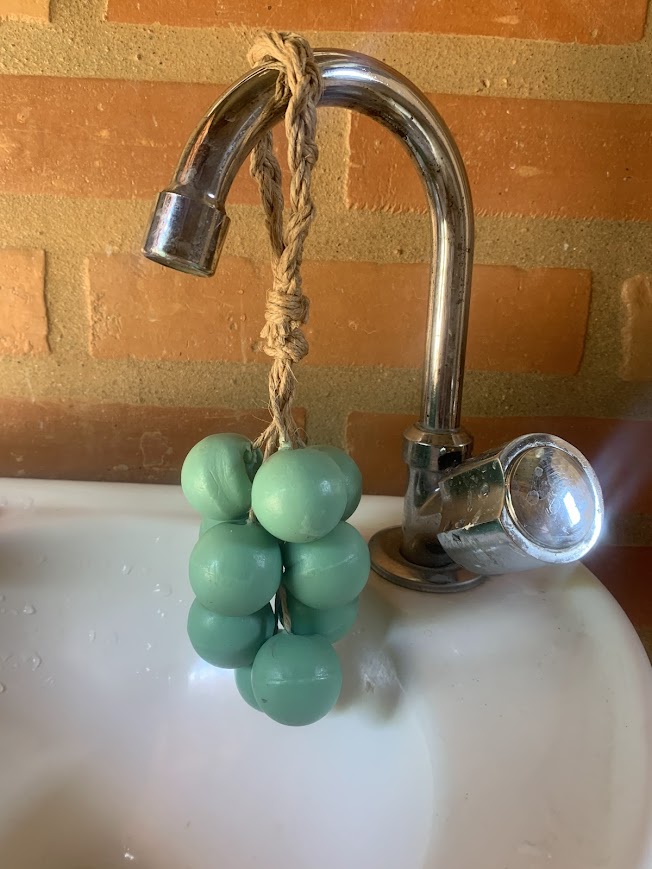 Pendure o cacho na torneira do banheiro e/ou da cozinha. Ao abrir a torneira, seu cacho já estará lá, pronto para o uso. Basta molhar as mãos e esfregá-las nas bolinhas.